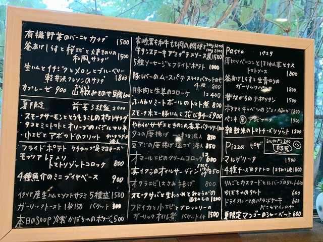 店内はこじんまり、それほど広くなく、全28席…カウンターのような横並びの席が6席ほどと、残りはテーブル席です。窓の外から見える木々に囲まれオシャレな店内ですが、照明は明るめで気取った感じは全くありません。