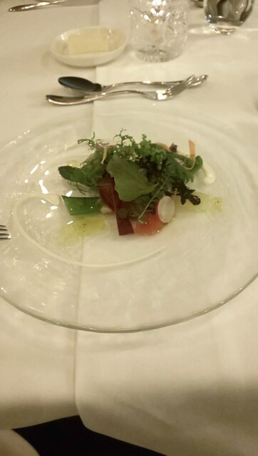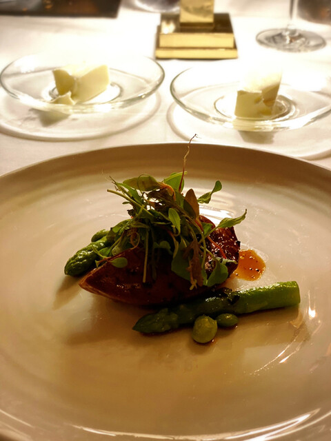 前菜は新鮮なアスパラガスを使用しており、周り...