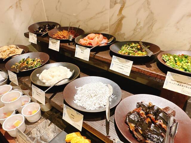 ビュッフェは和洋折衷です。パンをいろいろで、クロワッサンやチョコデニッシュもサクサクしています。朝カレーがあったので頂きましたが、ご飯がパサパサなのが気になりました。シラス、ひじき、納豆、明太子...