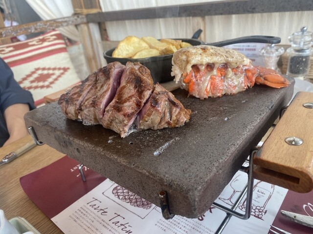 メインのステーキは300g以上のご注文で熱々の焼き石『ホットストーン』に乗せてご提供。