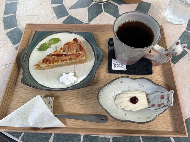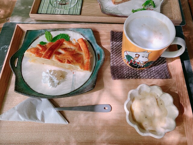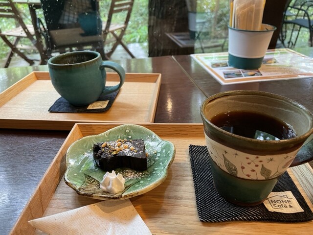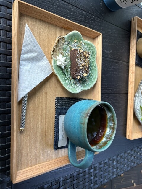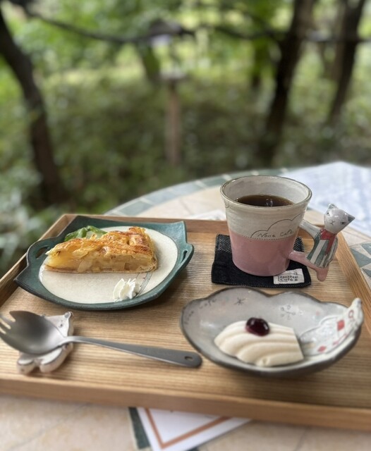 静かな森林の中で鳥の音を聞きながらカフェとケーキ。テラス席はほんとうに気持ち良くてぼーっと鳥を眺めながら癒されます。コーヒーはブレンドで酸味の少ない味でガトーショコラによく合います。妻はアップルパイで...