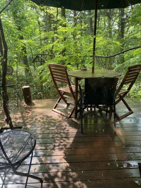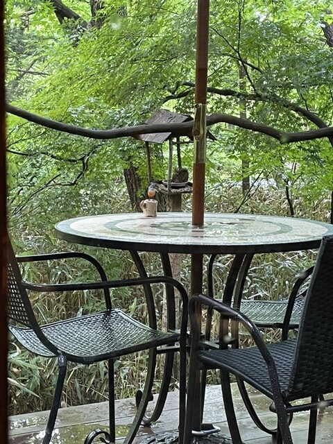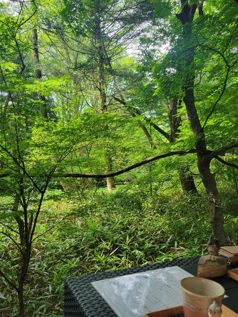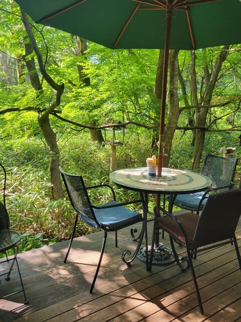 テラス席が最高です。6月平日10時半。関東は30度超えでも軽井沢は25度。木々のざわめき川のせせらぎを聞きながら美味しいコーヒーとケーキがいただけます。目の前に餌台があり運が良いとリスや野鳥が見られる...