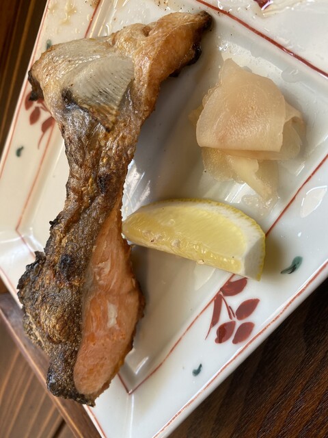 まずは大根おろしと漬物に醤油をかけ鮭に