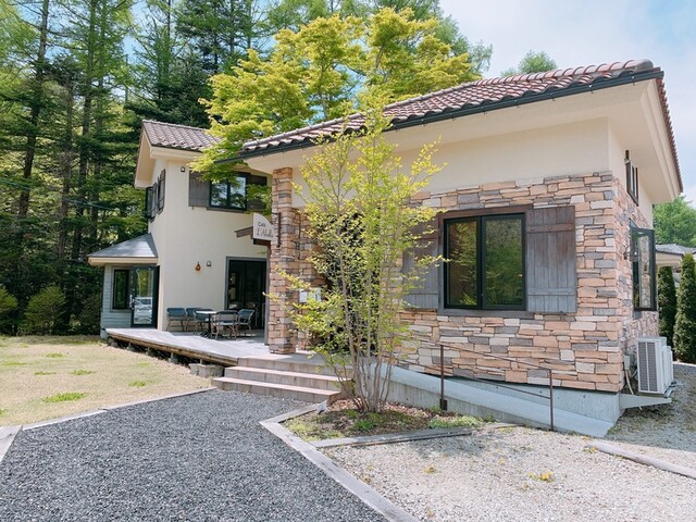 大きなテラスと南欧風の一軒家が目印のカフェラベイユ
