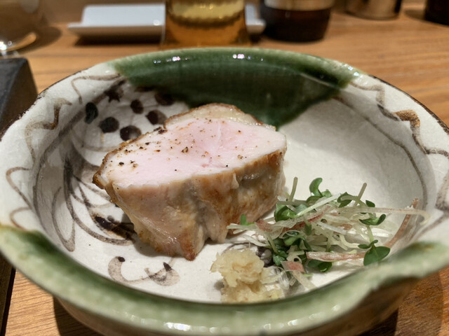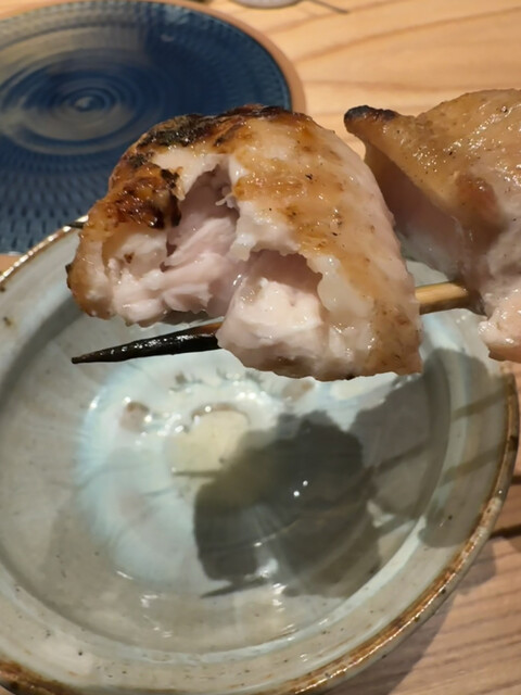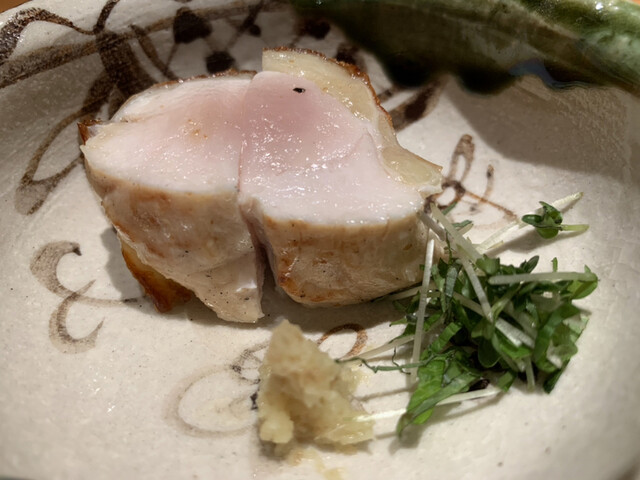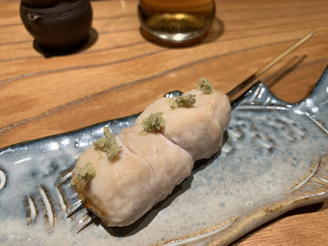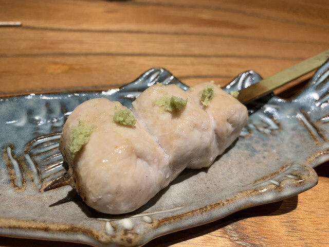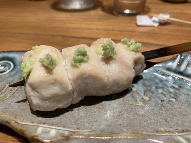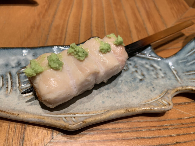 「鶏胸肉」…梅肉が乗せられていてこの酸味が鶏胸肉合う。一年前に比べて焼鳥の創作料理感を増している印象。