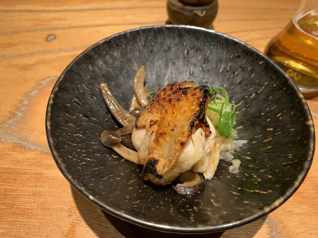 「信州黄金軍鶏、大根おろしとキノコ」…焼鳥を串だけでなく楽しませる創作焼鳥。色々手を変え品を変え、これも毎回楽しみの一つ。