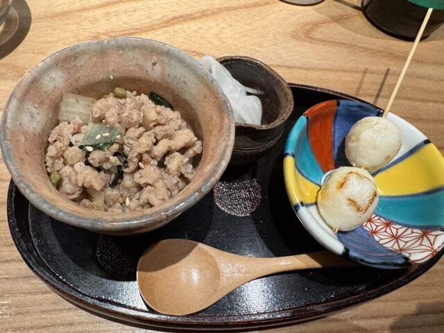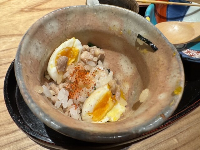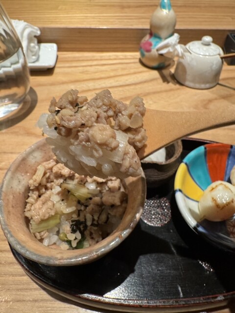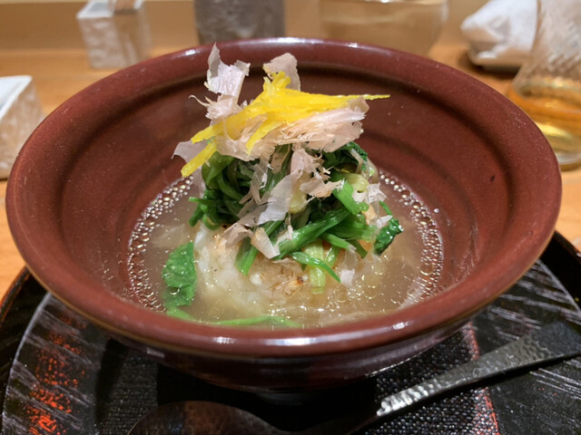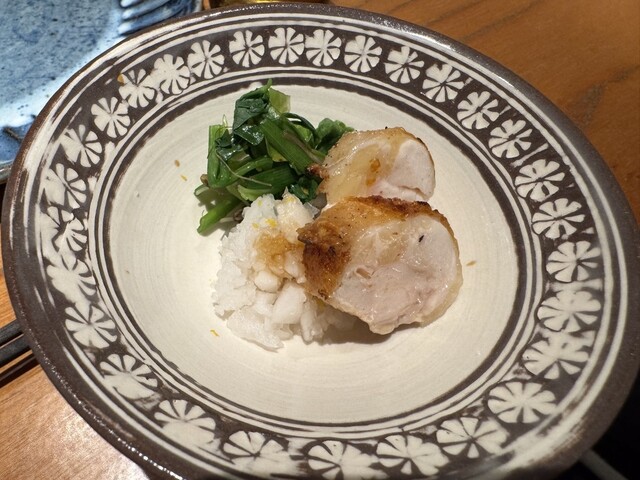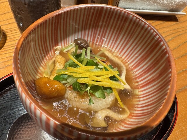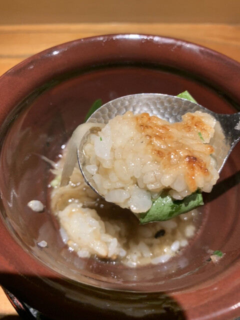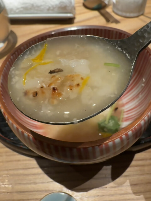…じっくり網で焼き上げた焼きおにぎりを生姜醤油で味付け、逆に出汁には醤油を使わず塩をベースにし、生姜、朝鮮人参、などを入れている。イメージは参鶏湯だそうで薬膳スープになっている。