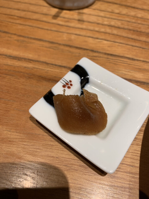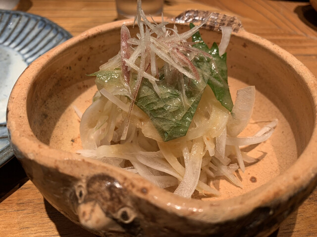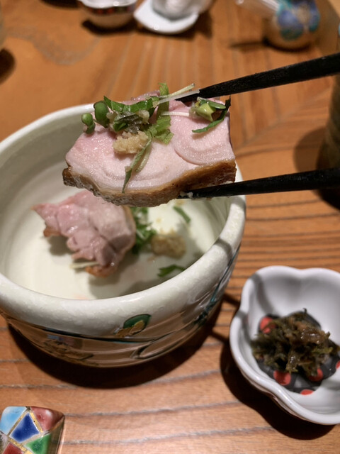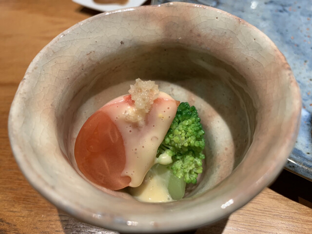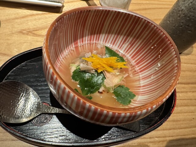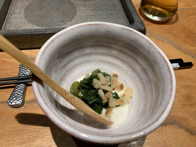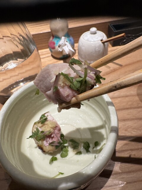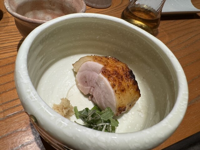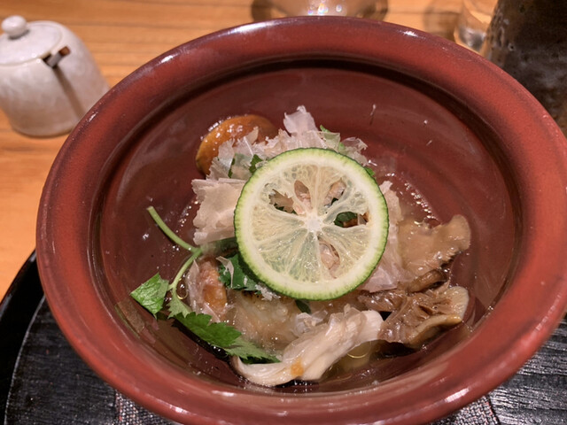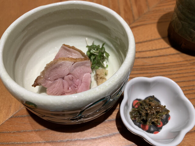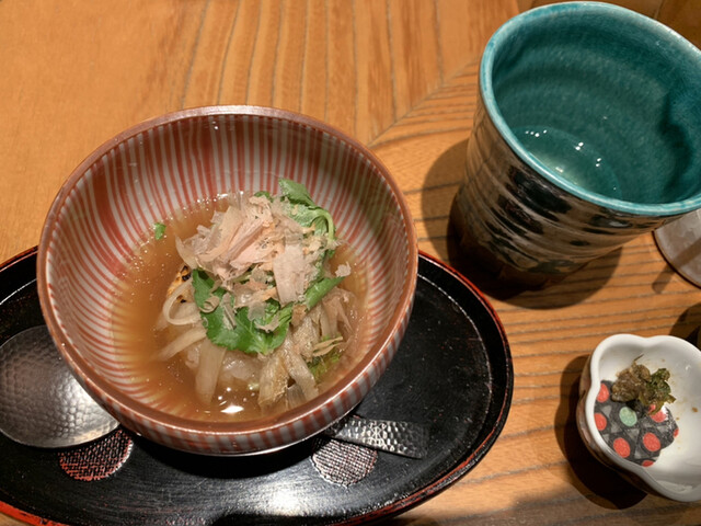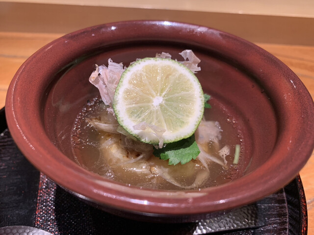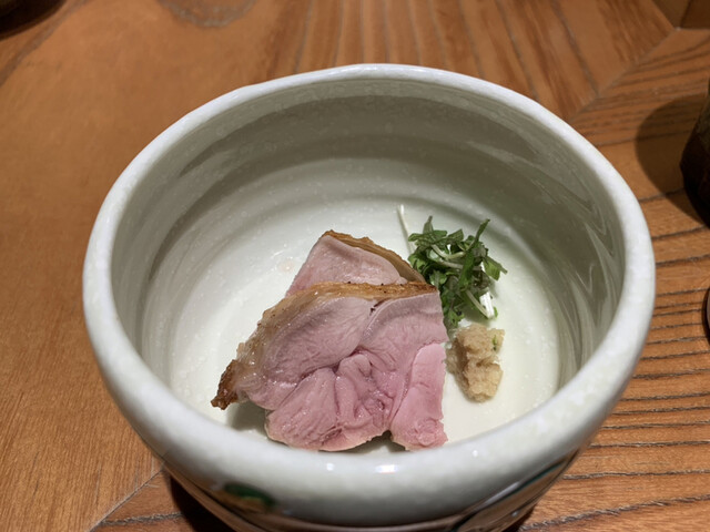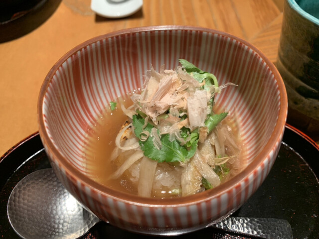 料理は「つくねと蕪の温かい出汁」からスタート。…スリ流し料理の一歩手前といった感じの出汁に生の生姜が効いていて、体もポカポカする。