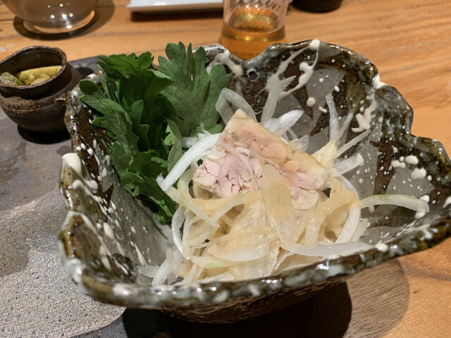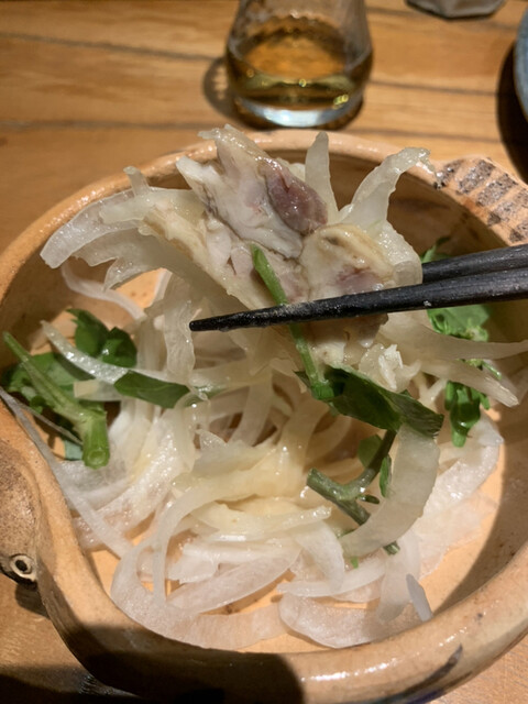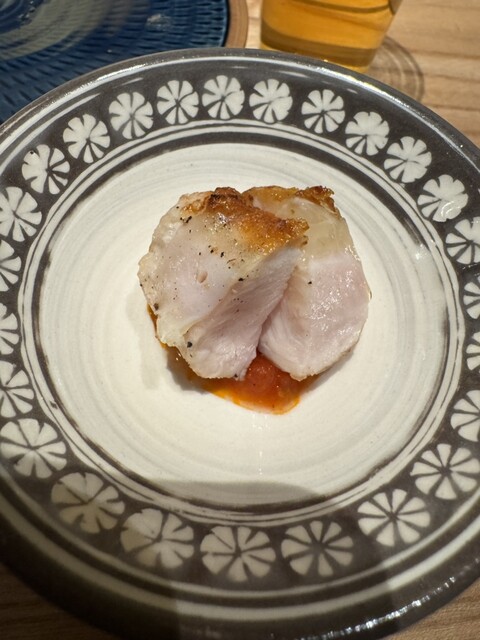 「甲斐路軍鶏のふくらはぎ」…最初に出て来たのは同じ甲斐路軍鶏のふりそでだったが、今回はふくらはぎ。いつもはもも肉が多いが、これもまた食感が硬いわけではなくしっかりしていて美味しい。