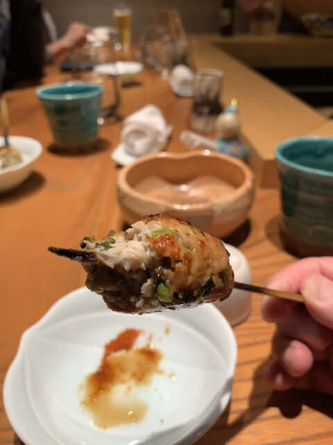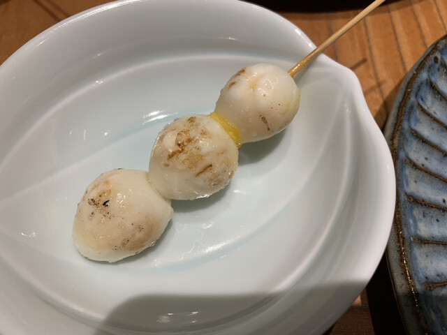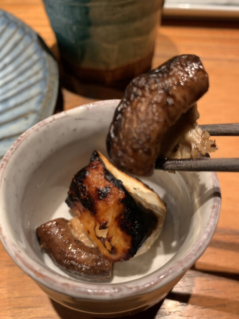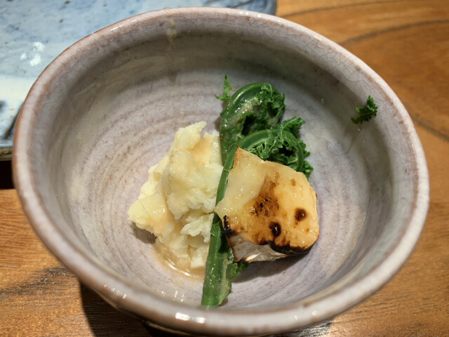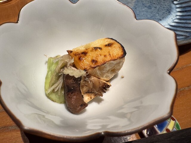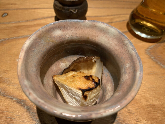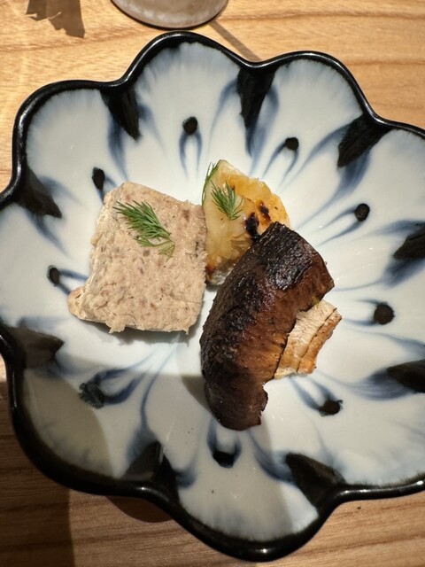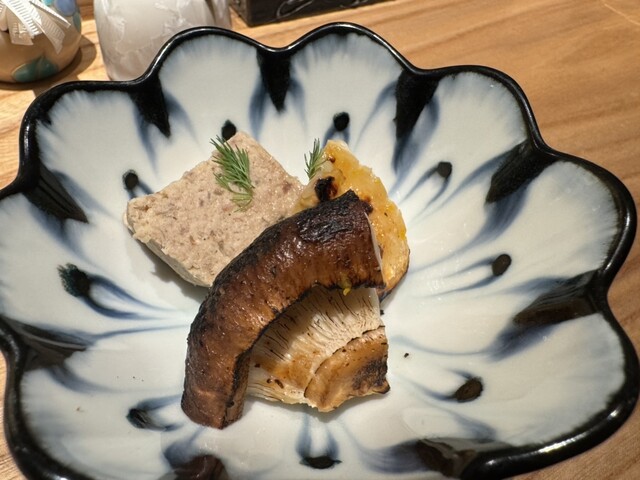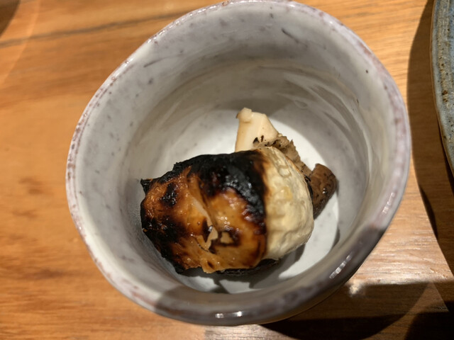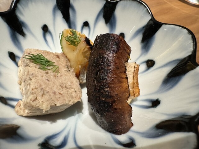 続いて「カマンベール、椎茸、鶏のパテ」…カマンベールは焼けてパリッとした表面になっていて食感も美味しい。以前はお味噌がカマンベールの味付けに使われていたが、今回はカマンベールがパテと椎茸の味付けになっている。これも美味い。