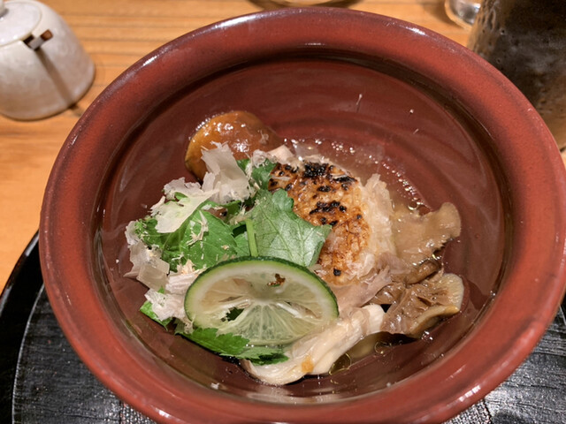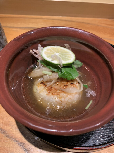 そして最後に定番の「焼きおにぎり出汁茶漬け」…鶏出汁スープを掛けていただく。笹切り(斜め切り)された牛蒡の味が滲み出ていてまた美味い。旨味あるスープと焼いたおにぎりの香ばしさ、鰹節と牛蒡の風味、酢橘の酸味のトータルバランスが素晴らしい。