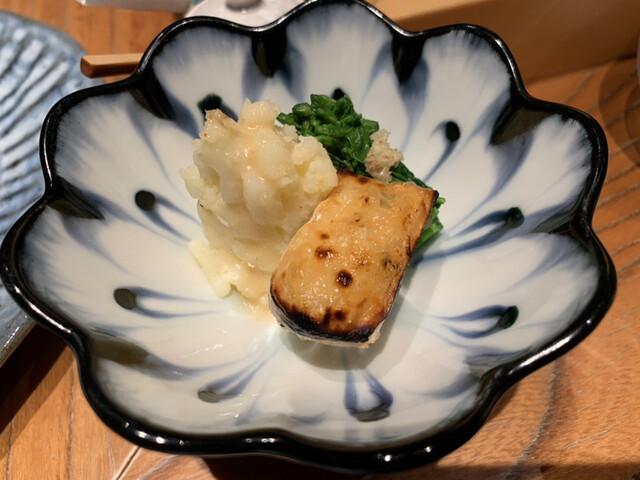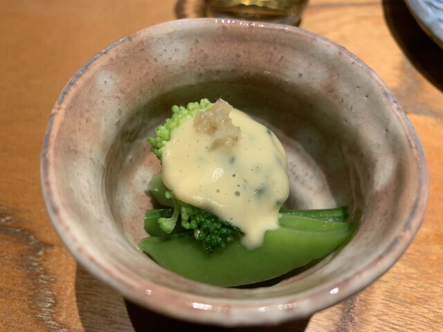 「新ジャガサラダとカマンベール味噌漬け、菜の花と」…新ジャガイモサラダはポテサラ風。カマンベールには中軽井沢駅そばの老舗味噌店『信州みそ 松屋本店』の味噌を漬けてあり、これが風味豊か。菜の花はやや苦味があり春を感じる。カマンベールと新ジャガと菜の花を交互に食べる色んなバリエーションの味がして、ちゃんとお通しからしっかり考えてくれていることがわかる。する。