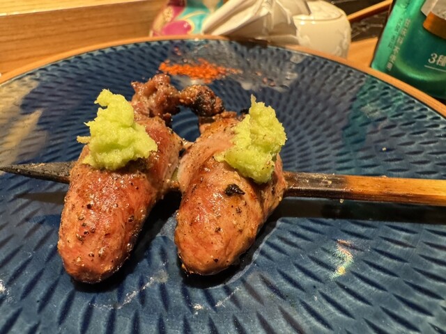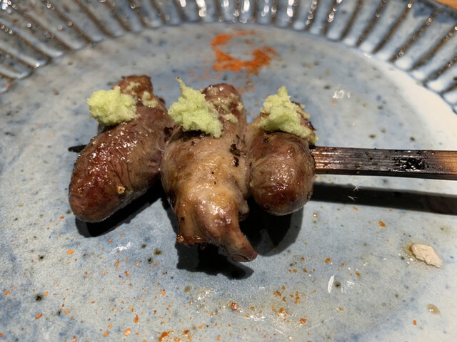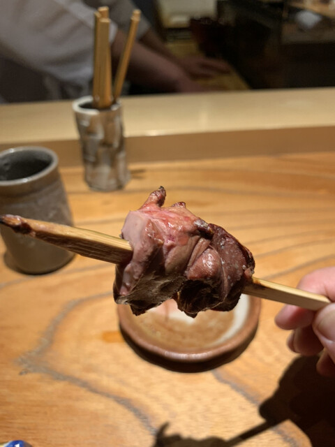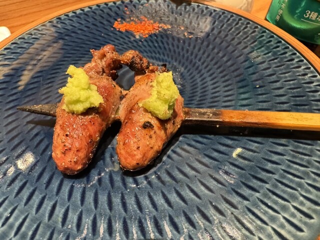 「ハツ」…噛むとぷりっとした食感のハツはたいそう美味。山葵が乗るが、脂のせいかさほど効かない。でも、美味い。