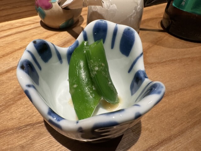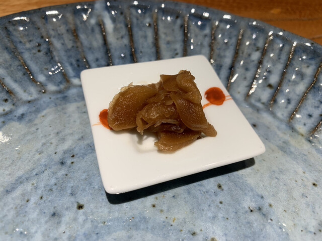 大将の土屋さんは炭をトンカチで整えながら、手を動かしネタを並べつつ、サービスの方がまずはお通しを出してくれる。
