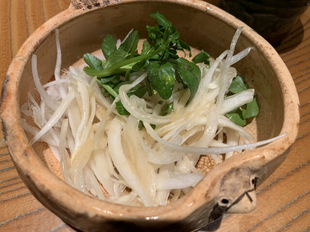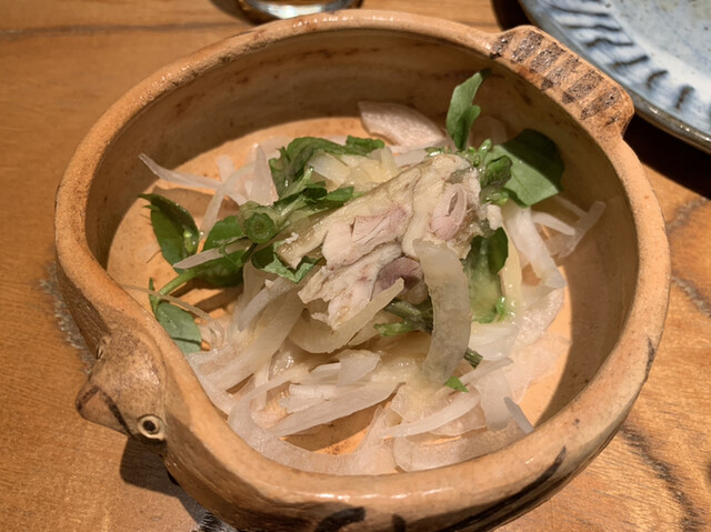 「ふりそで、せりと大根」…胸肉と手羽先の中間の肉である『ふりそで』は脂も程よく乗り、食感に弾力あり。脂を大根とせりがサッパリと中和させている。美味。