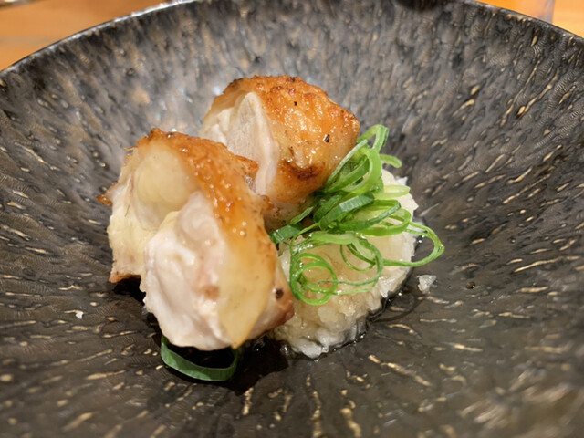 「ソリレス」…鶏モモ肉の足の付け根の部位。おろし醤油とネギを添えていただく。皮目はもちろんパリパリ、肉質は締まった感じで旨みあり。