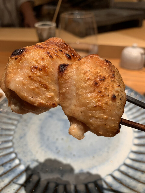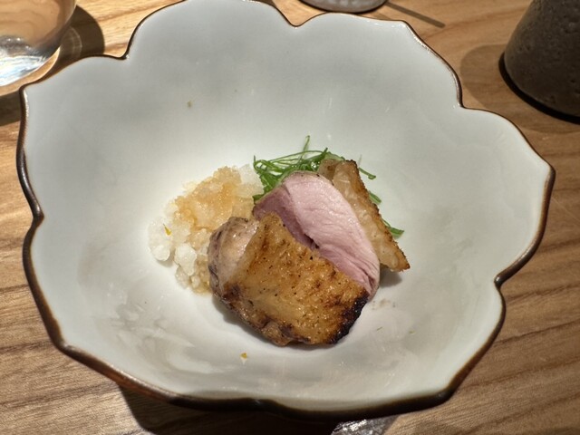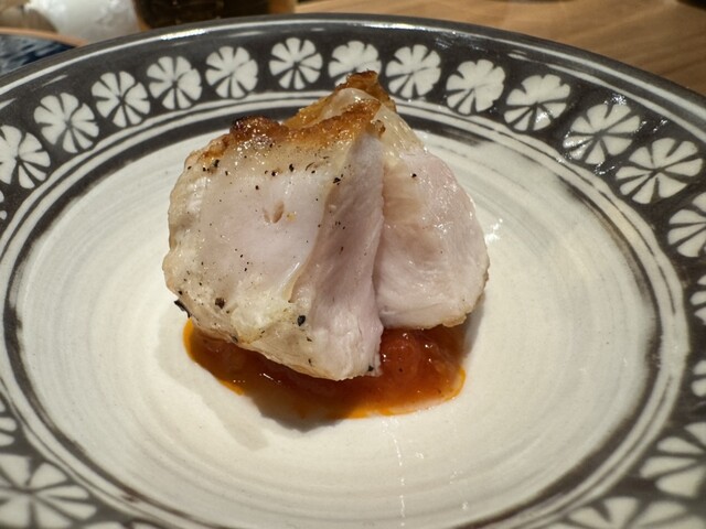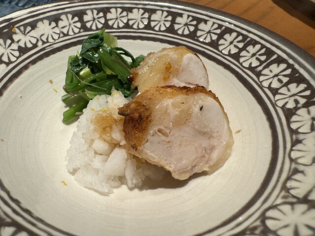 「甲斐路軍鶏の振袖」…少し弾力ある食感。相変わらず丁寧な焼き、見事な火入れを感じさせてくれる一品。