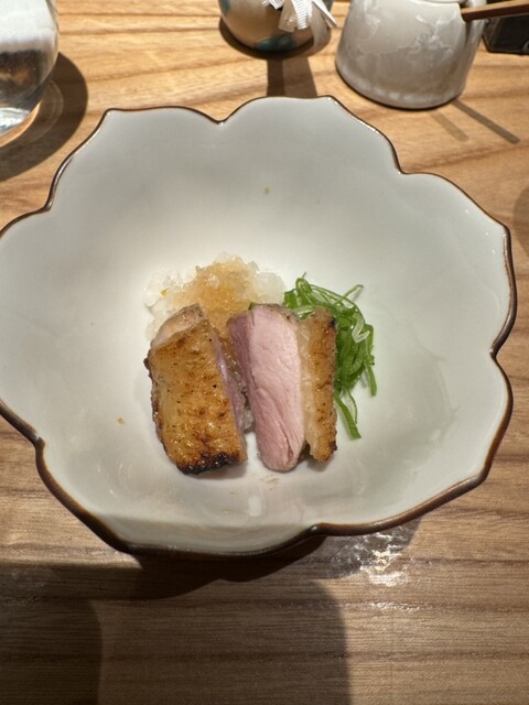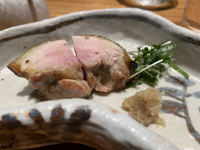 「もも肉、生姜をつけて」…ふくらはぎよりも皮目に脂が染み込んでいる。生姜がその味を引き締める。