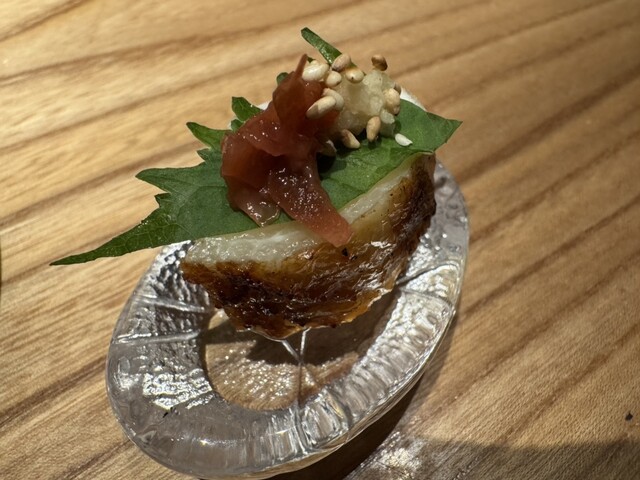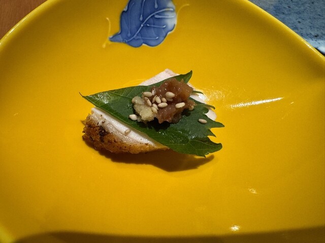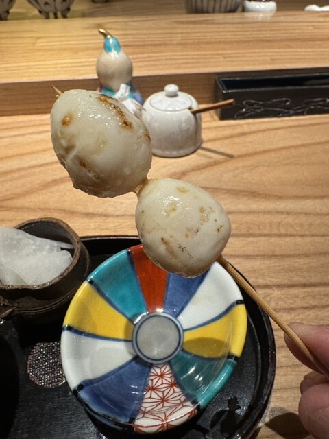 次はまだコース途中なのに、ご飯とうずらの玉子の共演モノが出てきた。…「下仁田ネギそぼろご飯、うずらの卵、大根の甘酢漬け」…ほぉ、これは力強い新商品。そぼろご飯自体も美味しいが、うずらの玉子が以前に比べて焼き方、味付けが圧倒的に美味しくなっている。ひとつはそのまま食べ、もうひとつはご飯に入れて混ぜ合わせて食べる。これもイケる!