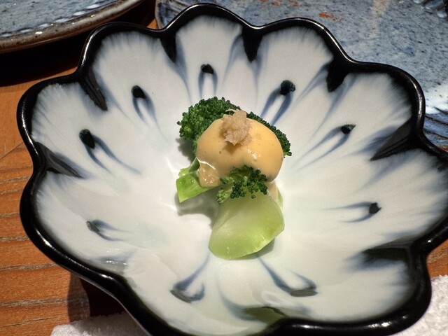 「ブロッコリー」…脂っこい一品の後にはサッパリと生のブロッコリーと自家製ドレッシングでいただき、口の中の脂を切る。