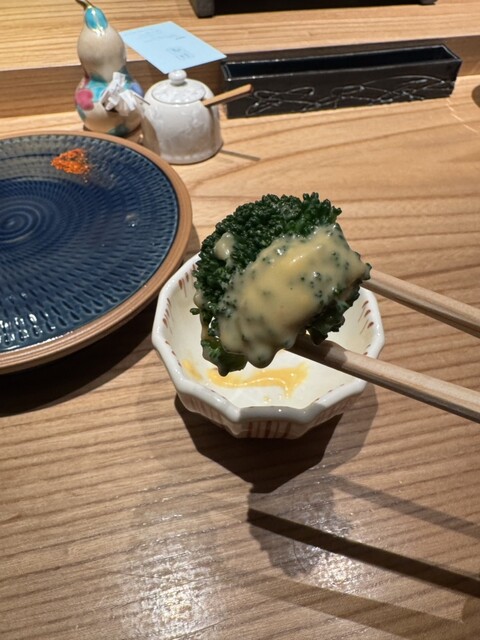 ここから鶏肉スタート。「胸肉、大葉と味噌」。…ひと口でいただく。大葉と味噌と胸肉のバランス良し。皮目もこんがりと美味しい。