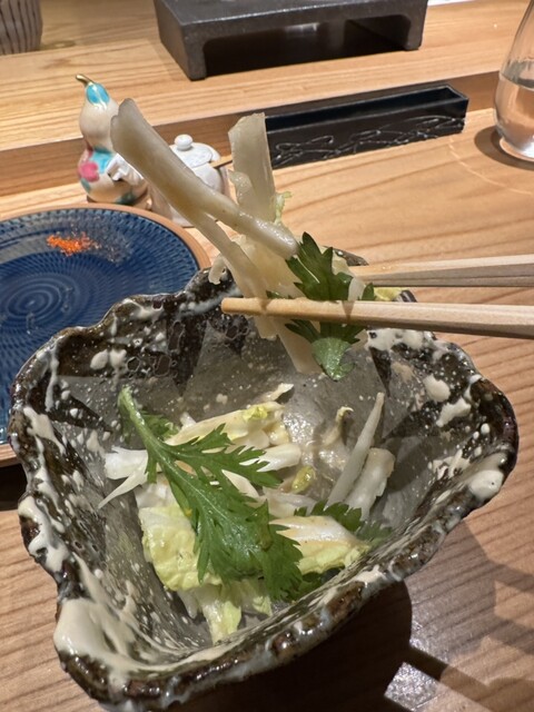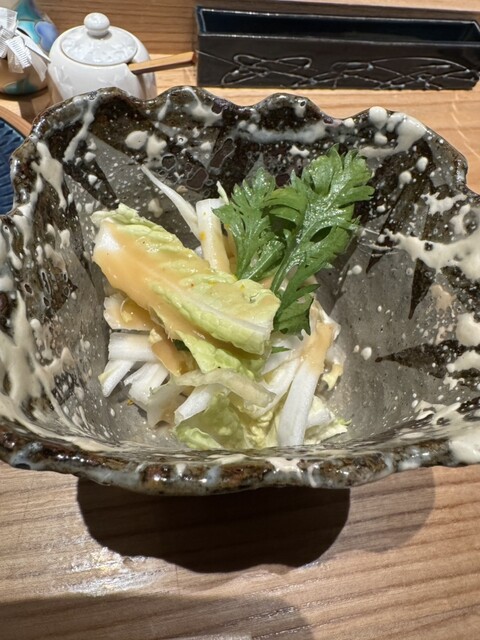 「白菜と春菊のサラダ」…箸休め的にサラダ。白菜のシャキシャキ食感が素晴らしい。