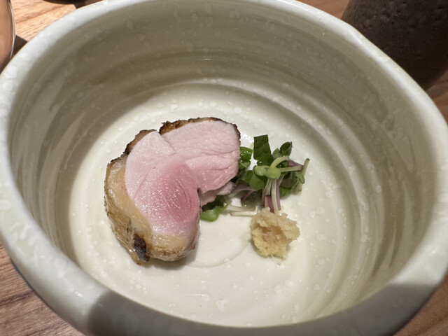 「肩肉」…これも楽しむのは皮めの脂…合わせるソースはまるでイタリアンの冷たいトマトのソース…これはまるでガスパチョというかラタトゥーユというか…酸味が効果的で美味しい。
