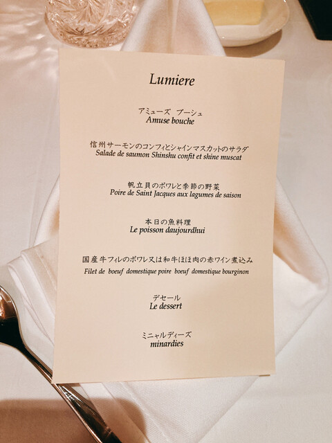 ルグランホテル&リゾートでディナーコースをいただきました。まず席に通されると、柔らかい照明とキャンドルの灯りがテーブルを優しく照らしていて、最初の一瞬から“特別な夜”を感じられる空間。