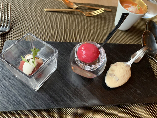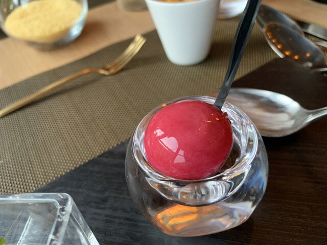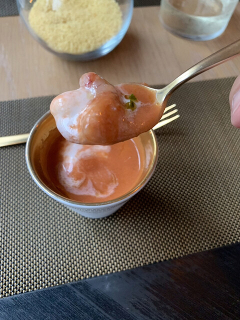 「ガスパチョ」…前回同様、夏にピッタリの一品。野菜とココナッツソルベの冷製スープ。赤海老が入り、濃厚クリーミー。ちゃんと美味しい。