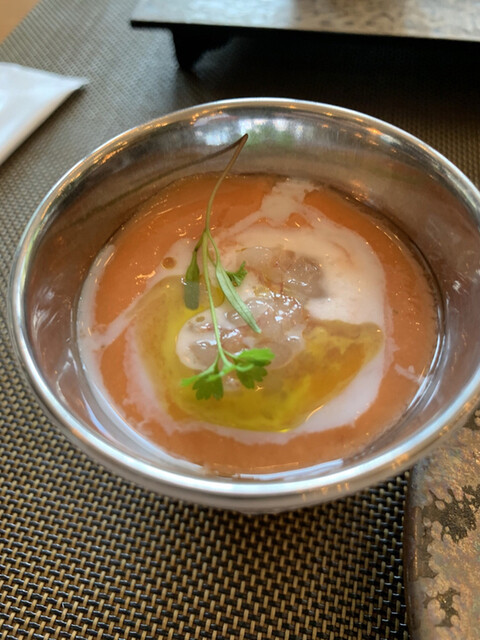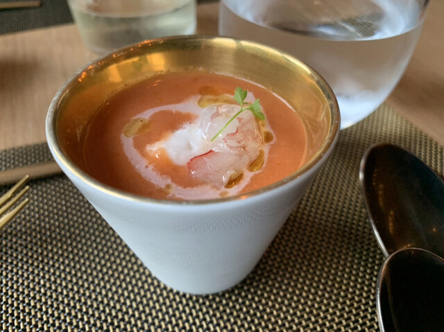 「ガスパチョ」…野菜とココナッツソルベの冷製スープ。赤海老が入り、濃厚クリーミー。初夏にピッタリの一品。