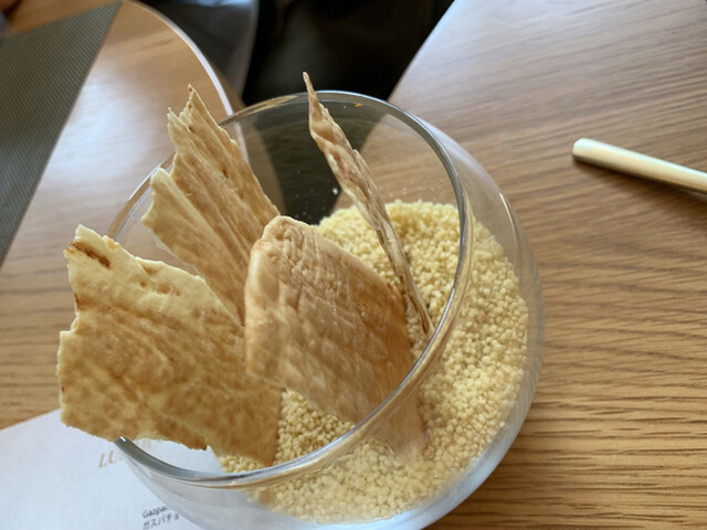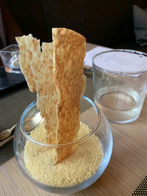 アミューズは「小麦粉とハモンセラーノを伸ばして作ったコカ(スペイン風ピザと言われる)」…パリパリ食感のスナックで美味しい。袋詰めがあったら買って帰りたい。