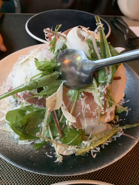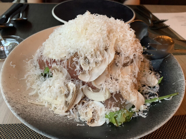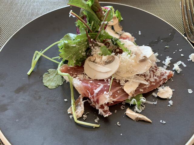 パルメジャンチーズ、ホワイトマッシュルーム、ハモンセラーノのサラダ
