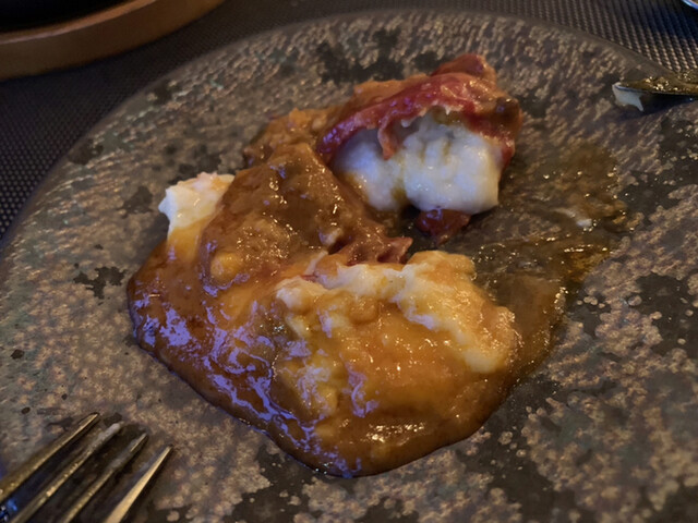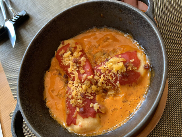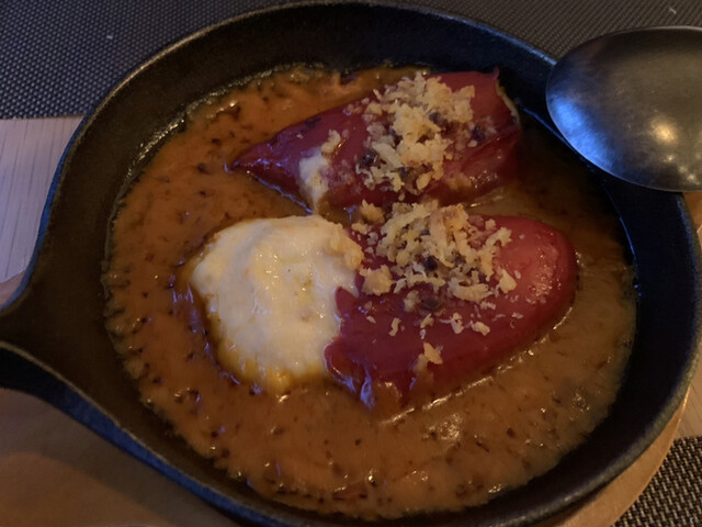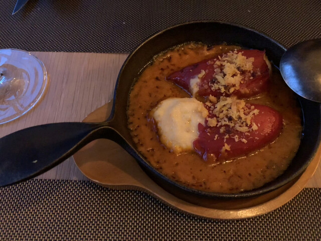これも前回と同じメニュー「海老(ランカゴールド)のピキージョ」…熱々の南部鉄器で運ばれて来てシェアしてもらった。ピキージョとはスペイン・ナバラ産のものしか名乗れない由緒正しい赤ピーマン。ソースにはオマール海老のソースを使い、中にはチーズが入る濃厚な味の一品。これも好み。一緒に来た仲間のひとりがピーマンが苦手、と言うと店の方が「キノコのアヒージョ」に変更してくれていた。対応力もグッド!