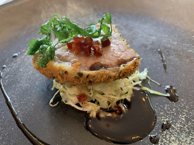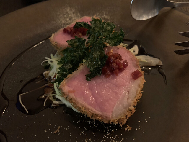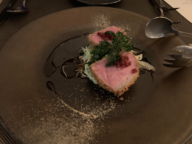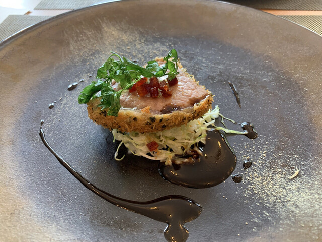 火入れ上手で衣のカリカリ感も伴って美味い。添えられた千切りキャベツが日本のトンカツ風でより美味しく感じてしまう。味付けのりんごのソース、バルサミコ、周辺に散りばめられたレモンパウダーが風味を増す。