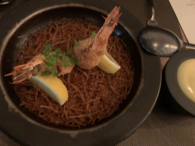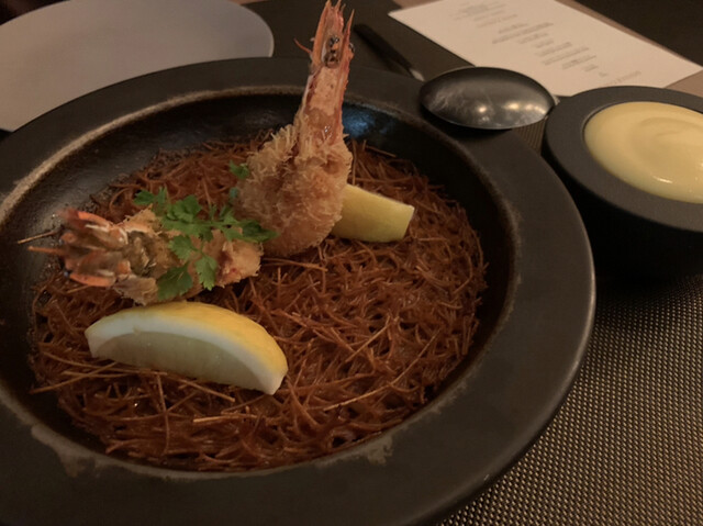 〆は「2種類のパスタを使ったパエリア」…パエリアはお米タイプではなく2種のパスタで作られたフィディア(カタルーニャ語で「パスタで作るパエリア」)。細麺はパリパリ、下の太麺はシットリと。パスタに染み込むスープも美味しくこれは好きなメニュー(前回もいただいたが、今回も美味い!)。何故かいる海老フライも嬉しい。添えられたアイオリソース(卵黄、オリーブオイルを乳化させ、すり潰したニンニク、レモン汁、塩、胡椒で作るソース)は後半使うと美味しく味変出来る。