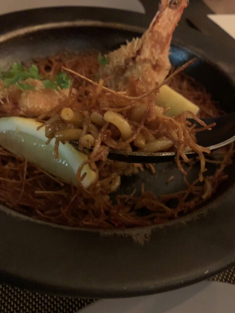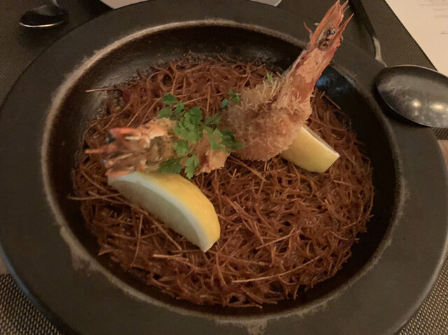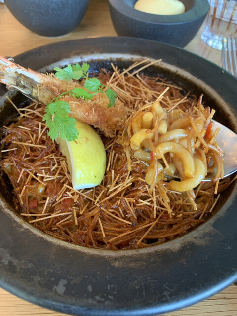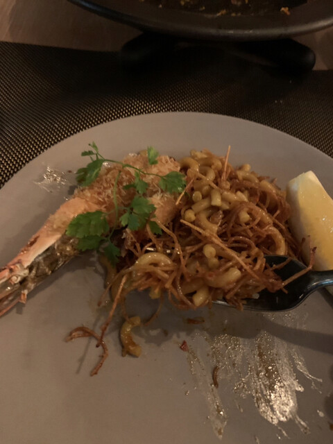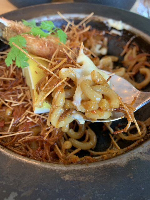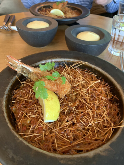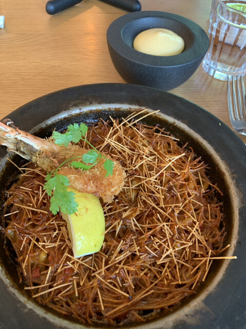 そしてメイン料理は6種の中からひとつ選ぶ。最後まで「スフレトルティージャ(ジャガイモの入ったふわふわオムレツ)」にするか「土鍋のイカ墨カルドッソ(出汁が多めのおじや風パエリア)」…イカ墨好きなので…、か、迷ったがファディア好きなので、「名物農耕海老出汁のフィディワ」をチョイス。…海老フライも乗り、少し太めのもちもちパスタとパリパリ極細麺のフィデワの組み合わせ。とっても美味しい。