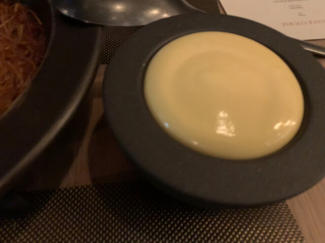 まずは内装、雰囲気もオシャレ、暖炉もあって天井高で居心地良い。カーペンターズの曲をムード音楽風にアレンジしたBGMが流れている。実はこの日この店の男性客10人以上いる中で僕だけがジャケットを着用してなくて、ひょっとしてドレスコードを知らずに入ってしまったのか?と戸惑ってしまった。どうやらそうではなくて、スマートカジュアルでもオッケーだそうで、その夜、来ていた皆さんはたまたまジャケットを全員着用していたよう。