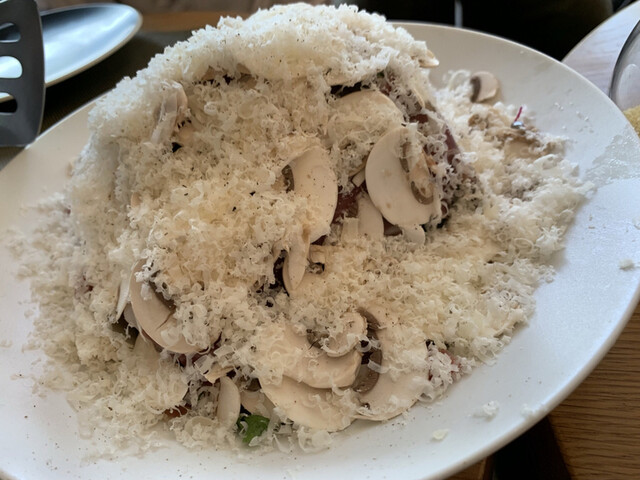 「ハモンセラーノ、パルメジャーノチーズ、ホワイトマッシュルームのサラダ」…スライスされた生のマッシュルームが新鮮で美味。チーズとレタスや水菜と和えていただく。これはバランス良く美味しい。鉄板メニュー! おススメ。