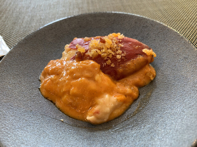 ⑤「鴨、オレンジ」…これらをバルサミコソースでいただく。ほんのひと口なので、これはイマイチ美味いのか分かりにくい。