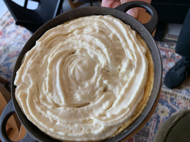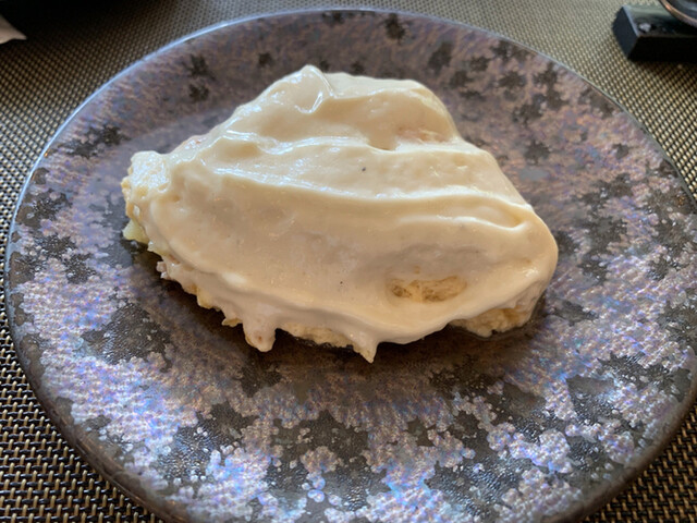 デザートは場所を移動して暖炉前へ「チーズのジェラートとバスクチーズ」