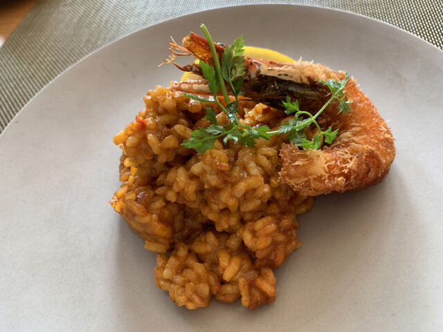乗ってくる海老フライが美味しく嬉しい。添えられたアイオリソース(卵黄、オリーブオイルを乳化させ、すり潰したニンニク、レモン汁、塩、胡椒で作るソース)は味変に使うと効果的。