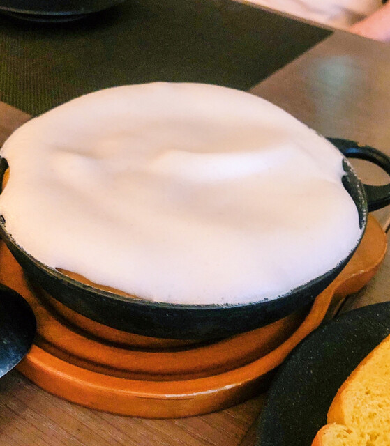 ジャガイモが敷かれたオムレツにふわふわの卵のムースが!味もだし見た目も真っ白素敵。ふわふわの卵ソースが美味し過ぎる!