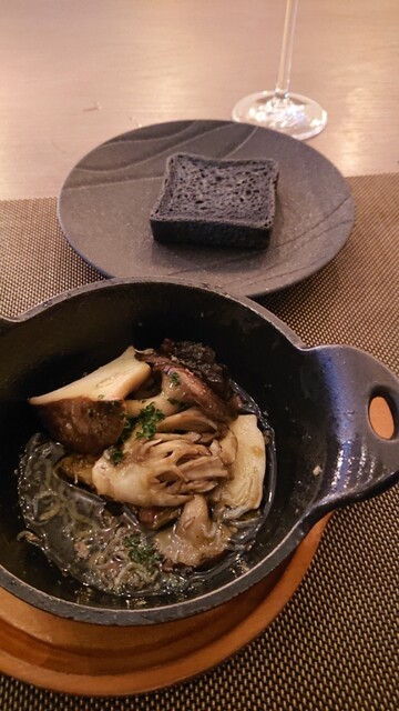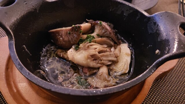 ・信州キノコのアヒージョ(エリンギ、マイタケ、ジャコなどでキノコが濃厚、竹の炭のパンとともに)