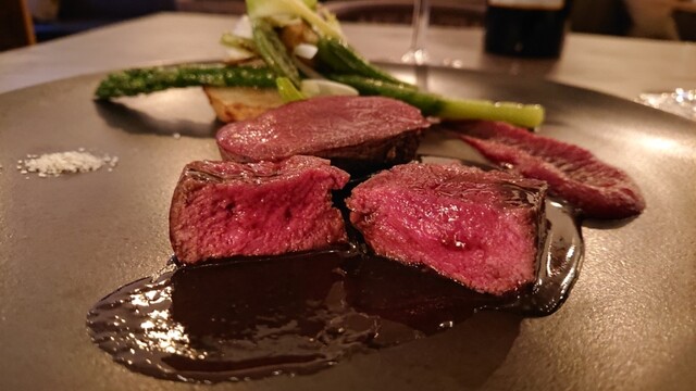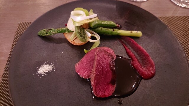 ・長野県大鹿村の鹿肉ロースト 信州野菜添え(ローストが柔らかくさすがの絶妙な焼き加減♪塩や甘いバルサミコ酢も絶妙♪ビーツのピューレで楽しめ、信州産のアスパラガス、ゼンマイ、長芋、蕪、ズッキーニなども)