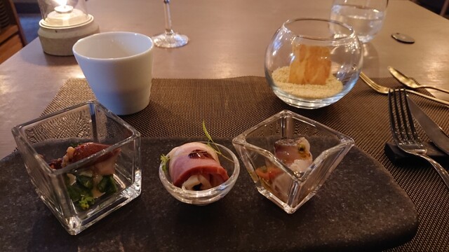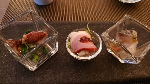 サワラのマリネ、カモのハム、ホタルイカと菜の花の酢味噌(どれも上質)