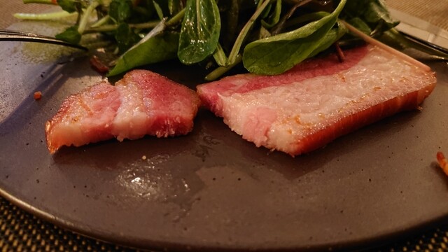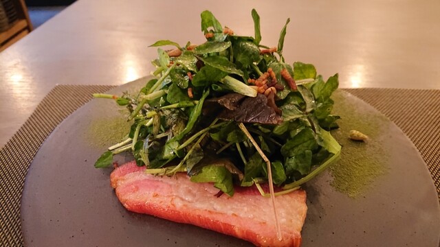 ・イベリコ豚ベーコン炙りと野菜のサラダ(辛味があるクレソンもあり野菜たっぷり、ベーコン柔らかい)