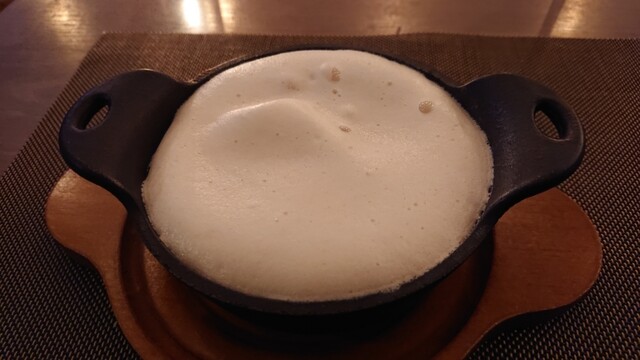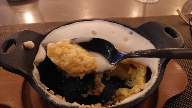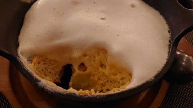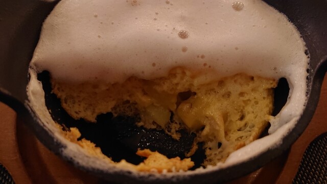 ・スフレトルティージャ(ジャガイモとベーコン、玉ねぎが入った柔らかい卵が入った泡のスフレで、黒いフライパンはアツアツだけど焦げずに雑妙な焼き加減が素晴らしい)