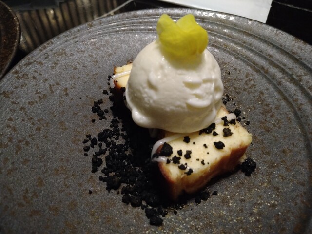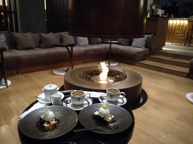 デザートは暖炉の脇のソファーでバスクチーズケーキを
