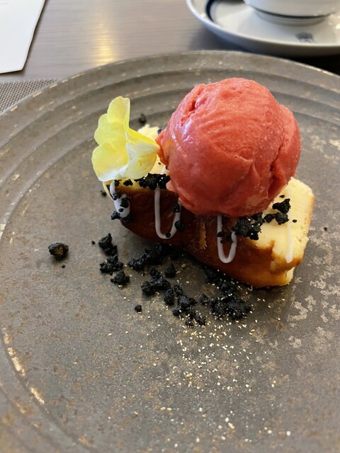 デザートはバスクチーズケーキの上にラズベリーのソルベが乗っていて、可愛らしいお花も添えてありました。