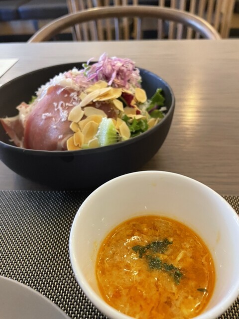 サラダは大きく広がった生ハムが2枚も乗っていて、キウイやアーモンドも入っていてとにかくボリュームがありました。これだけでお腹も満たされる感じです。